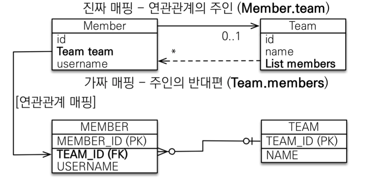 - JPA는 두 객체 연관관계 중 하나를 정해서 테이블 외래키를 관리, 이것이 연관관계 주인