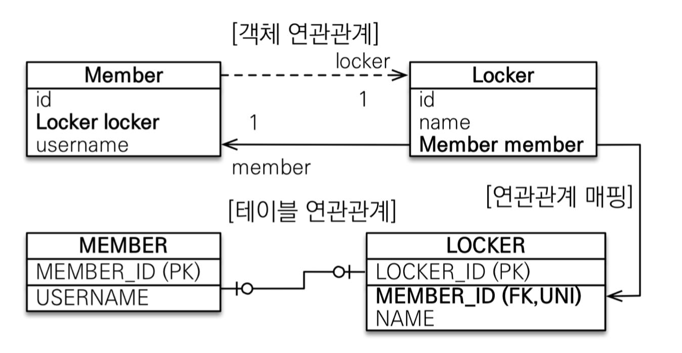 @Entity public class Member { ... @OneToOne @JoinColumn(name = "LOCKER_ID") private Locker locker } @Entity public class Locker { @Id @GeneratedValue @Column(name = "LOCKER_ID") private Long id; private String name; ... }