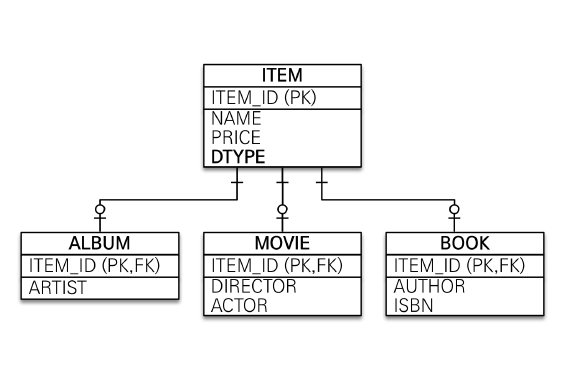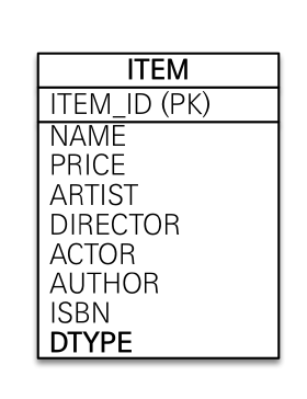 - 테이블은 타입의 개념이 없어 타입을 구분하는 컬럼을 추가 (DTYPE 컬럼을 구분컬럼으로 사용)