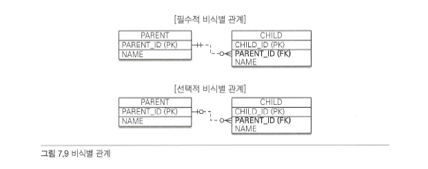 - 식별 관계는 비식별 관계보다 테이블 구조가 유연하지 못함