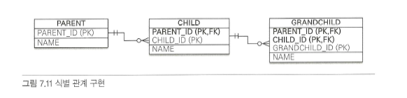 - 식별 관계는 부모 테이블 기본 키를 자식 테이블로 전파하며 자식 테이블의 기본 키 컬럼 증가