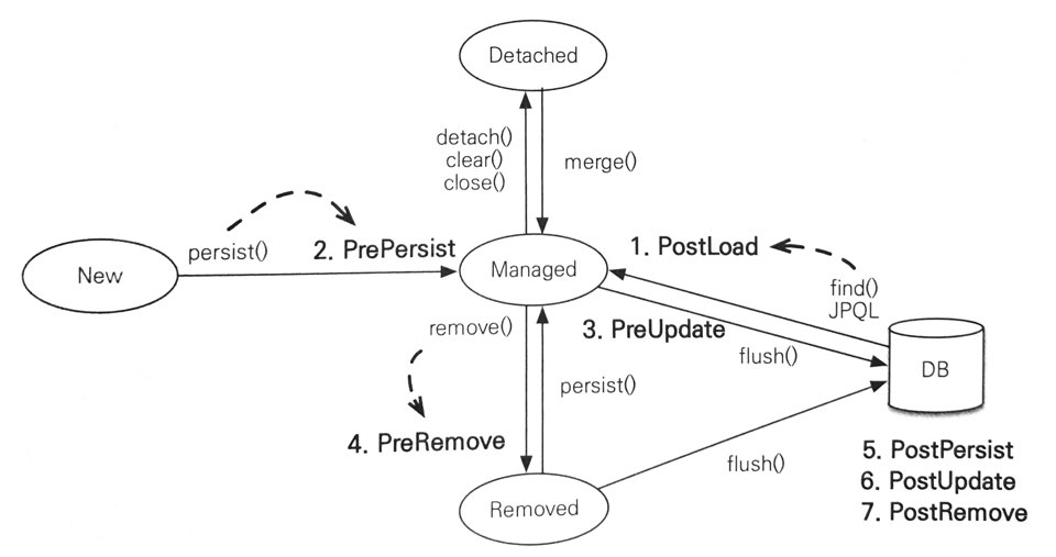 @Entity public class Duck { @Id @GeneratedValue public Long id; private String name; @PrePersist public void prePersist() { System.out.println("Duck.prePersist id=" + id); } @PostPersist public void postPersist() { System.out.println("Duck.postPersist id=" + id); } @PostLoad public void postLoad() { System.out.println("Duck.postLoad"); } @PreRemove public void preRemove() { System.out.println("Duck.preRemove"); } @PostRemove public void postRemove() { System.out.println("Duck.postRemove"); } }//엔티티를 저장할 때 결과 Duck.prePersist id=null Duck.postPersist id=1