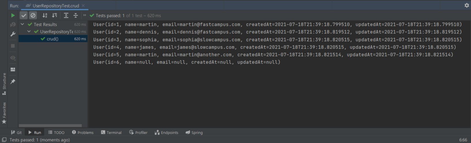 data.sql이 잘 실행되어, 테스트 코드가 정상적으로 완료됐다.