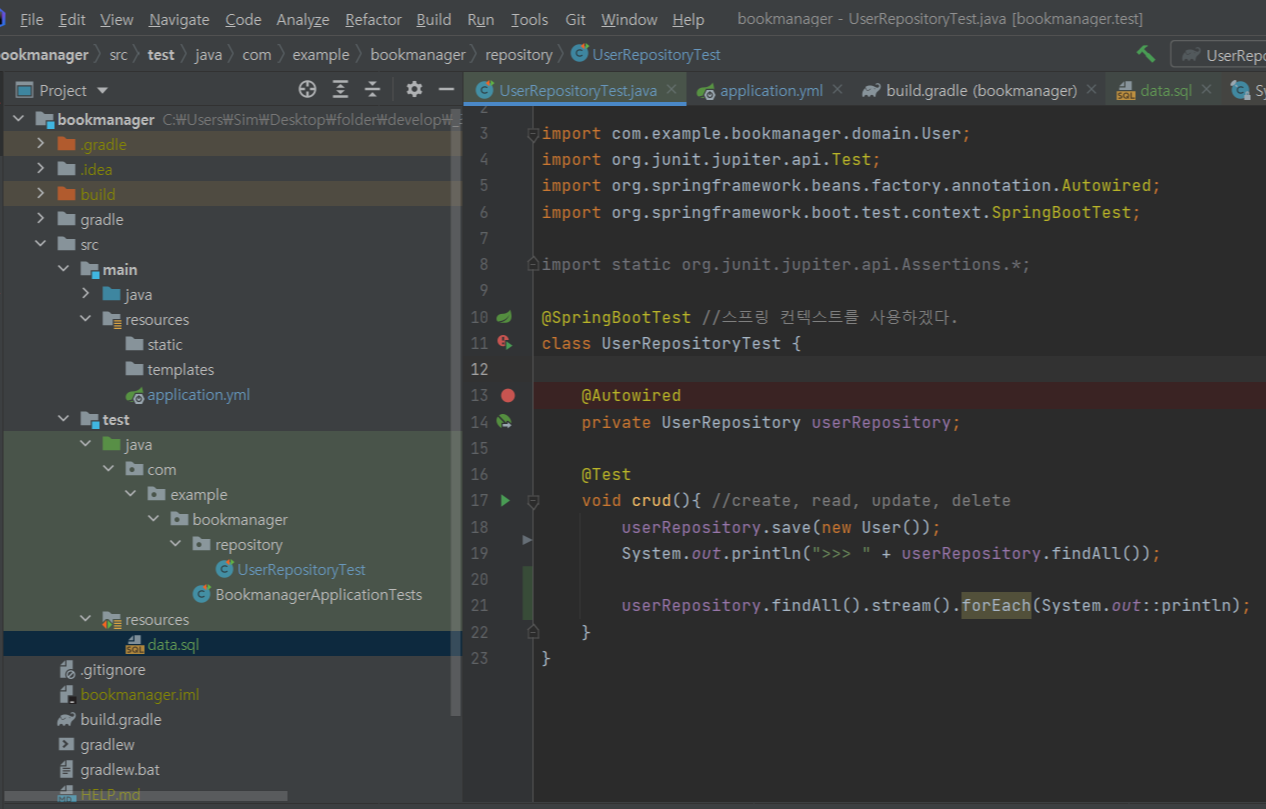 Caused by: org.springframework.beans.factory.BeanCreationException: Error creating bean with name 'dataSourceScriptDatabaseInitializer' defined in class path resource [org/springframework/boot/autoconfigure/sql/init/DataSourceInitializationConfiguration.class]: Invocation of init method failed; nested exception is org.springframework.jdbc.datasource.init.ScriptStatementFailedException: Failed to execute SQL script statement #1 of URL [file:/C:/Users/Sim/Desktop/folder/develop/_%ec%b4%88%ea%b2%a9%ec%9e%90%20%ea%b0%95%ec%9d%98/Part4/bookmanager/build/resources/test/data.sql]: insert into user (`id`, `name`, `email`, `created_at`, `updated_at`) values (1, 'martin', 'martin@fastcampus.com', now(), now()); nested exception is org.h2.jdbc.JdbcSQLSyntaxErrorException: Table "USER" not found; SQL statement: insert into user (`id`, `name`, `email`, `created_at`, `updated_at`) values (1, 'martin', 'martin@fastcampus.com', now(), now()) [42102-200]